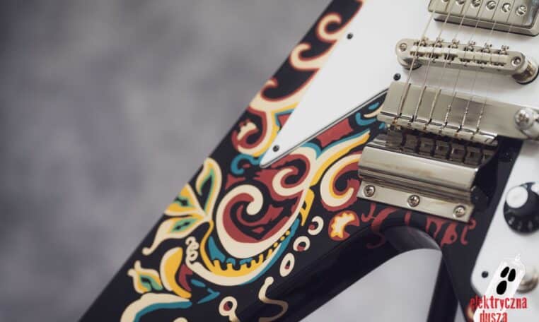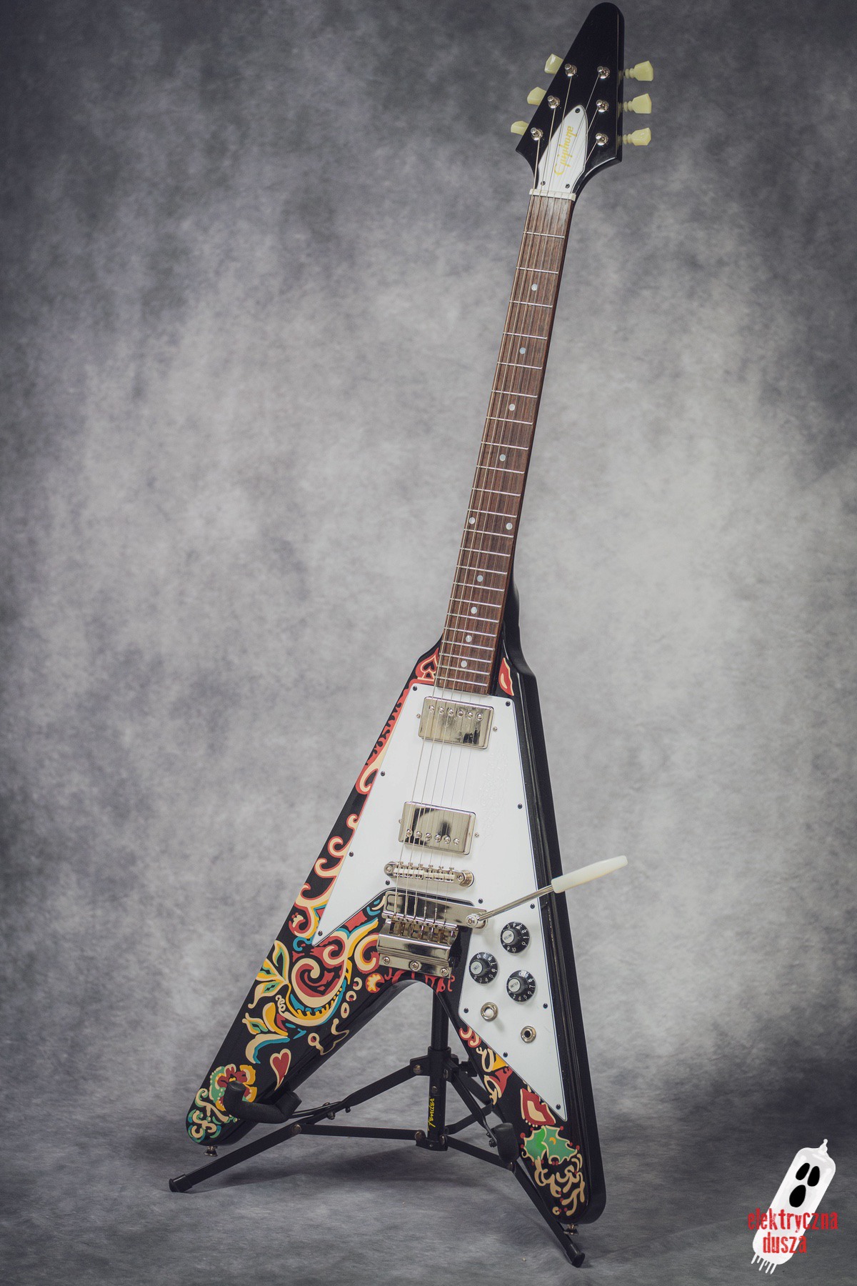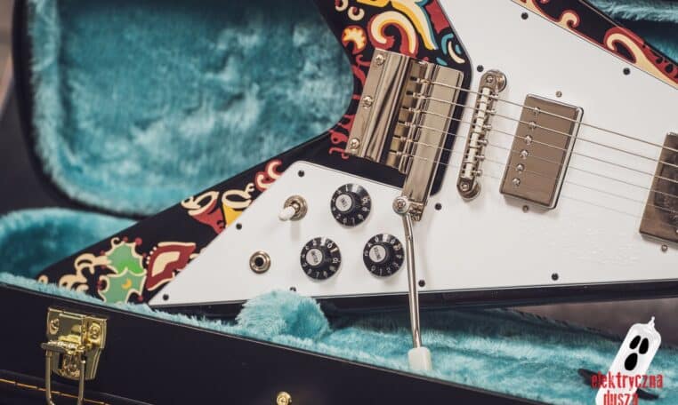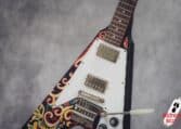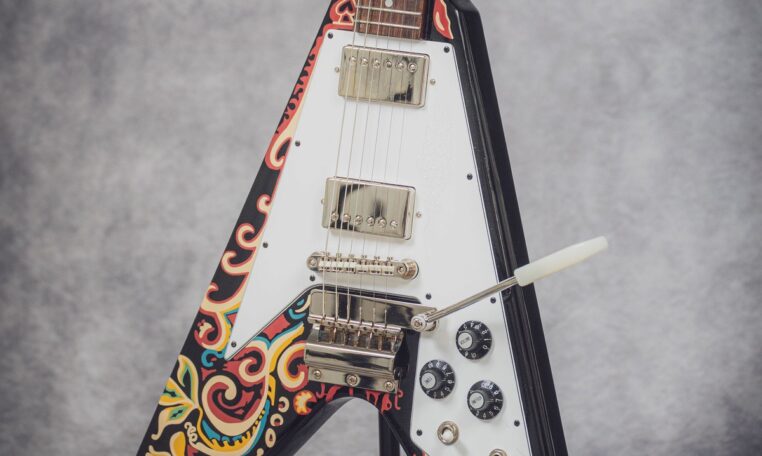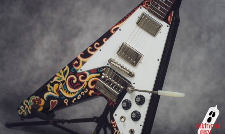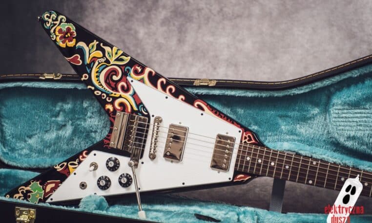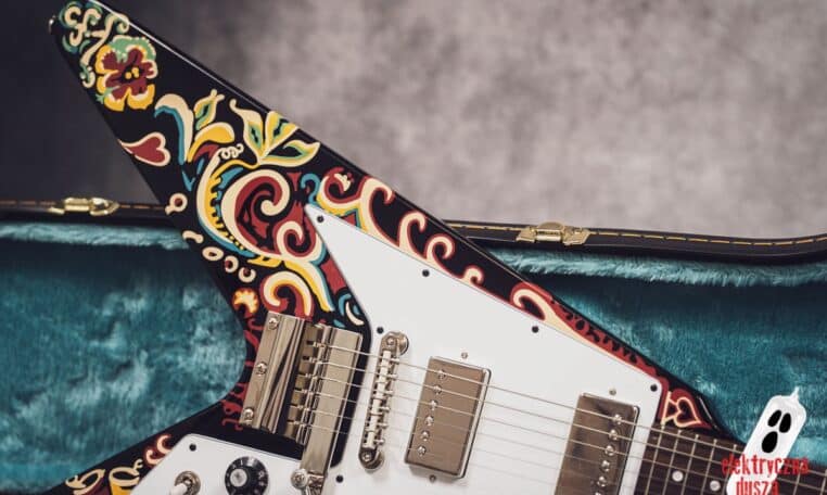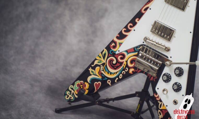 Electric Soul presents the Epiphone “Love Drops” Flying V, an iconic V-shaped guitar inspired by Jimi Hendrix’s old Gibson, which he personally painted with his famous psychedelic design.
