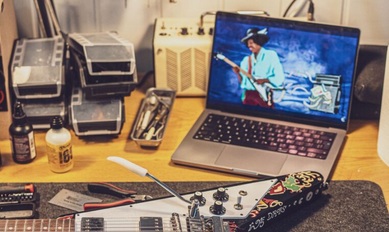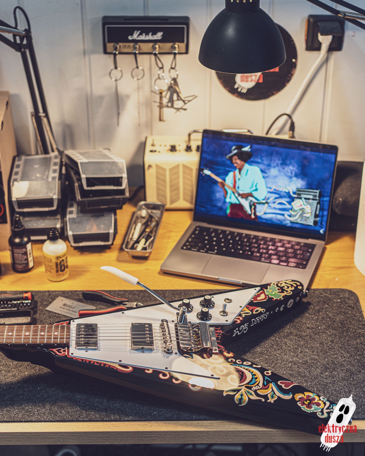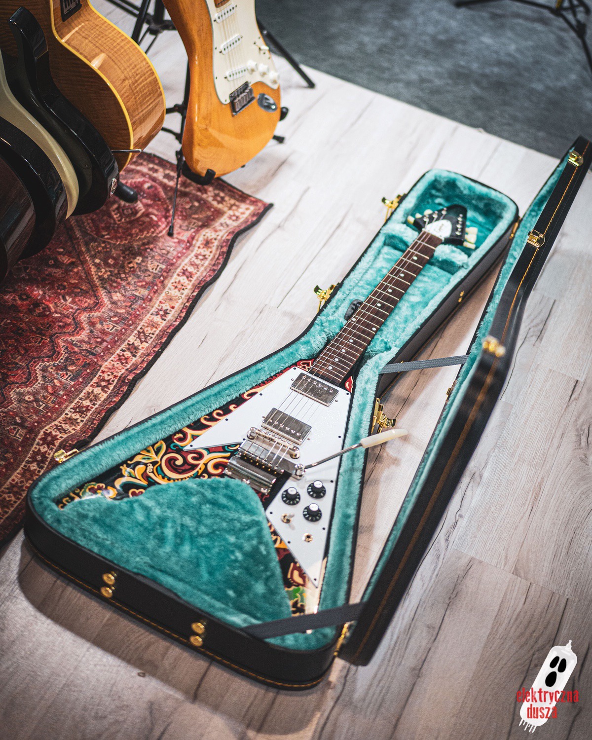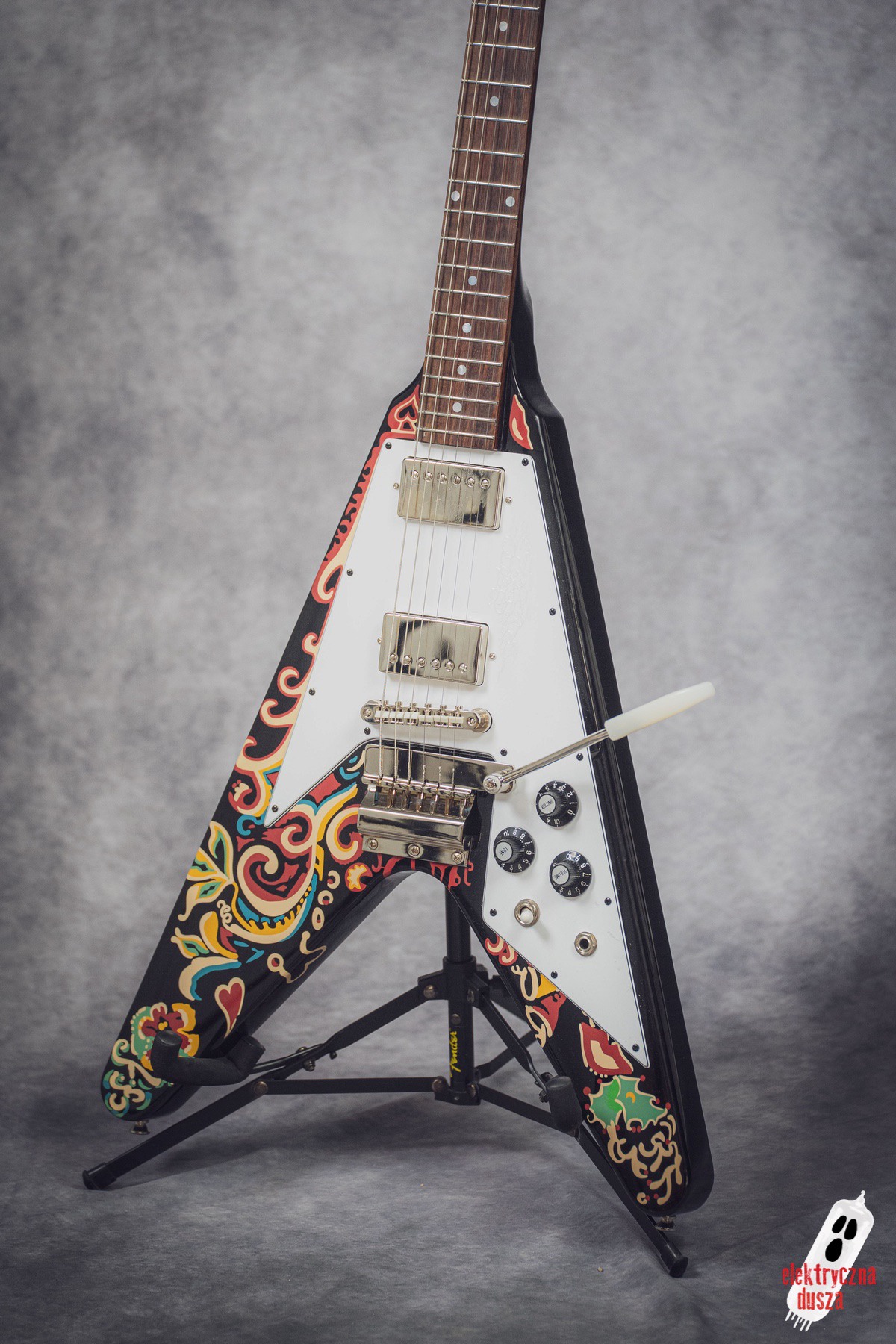 Electric Soul presents the Epiphone “Love Drops” Flying V, an iconic V-shaped guitar inspired by Jimi Hendrix’s old Gibson, which he personally painted with his famous psychedelic design.