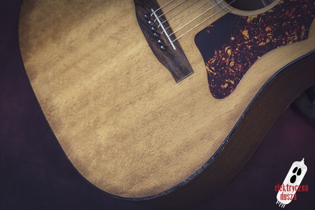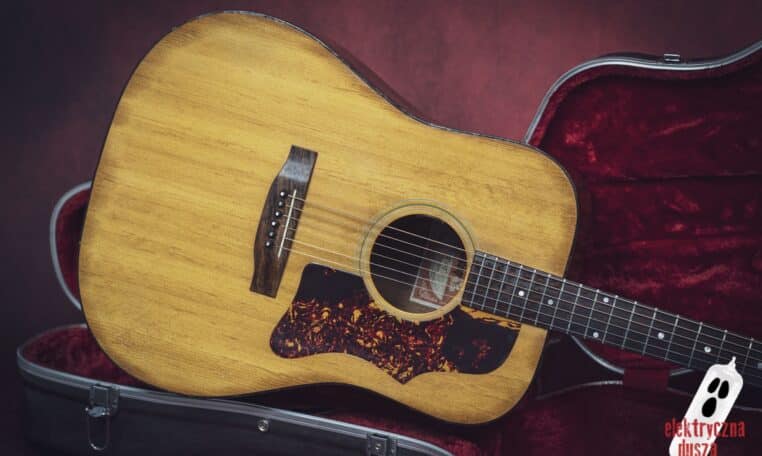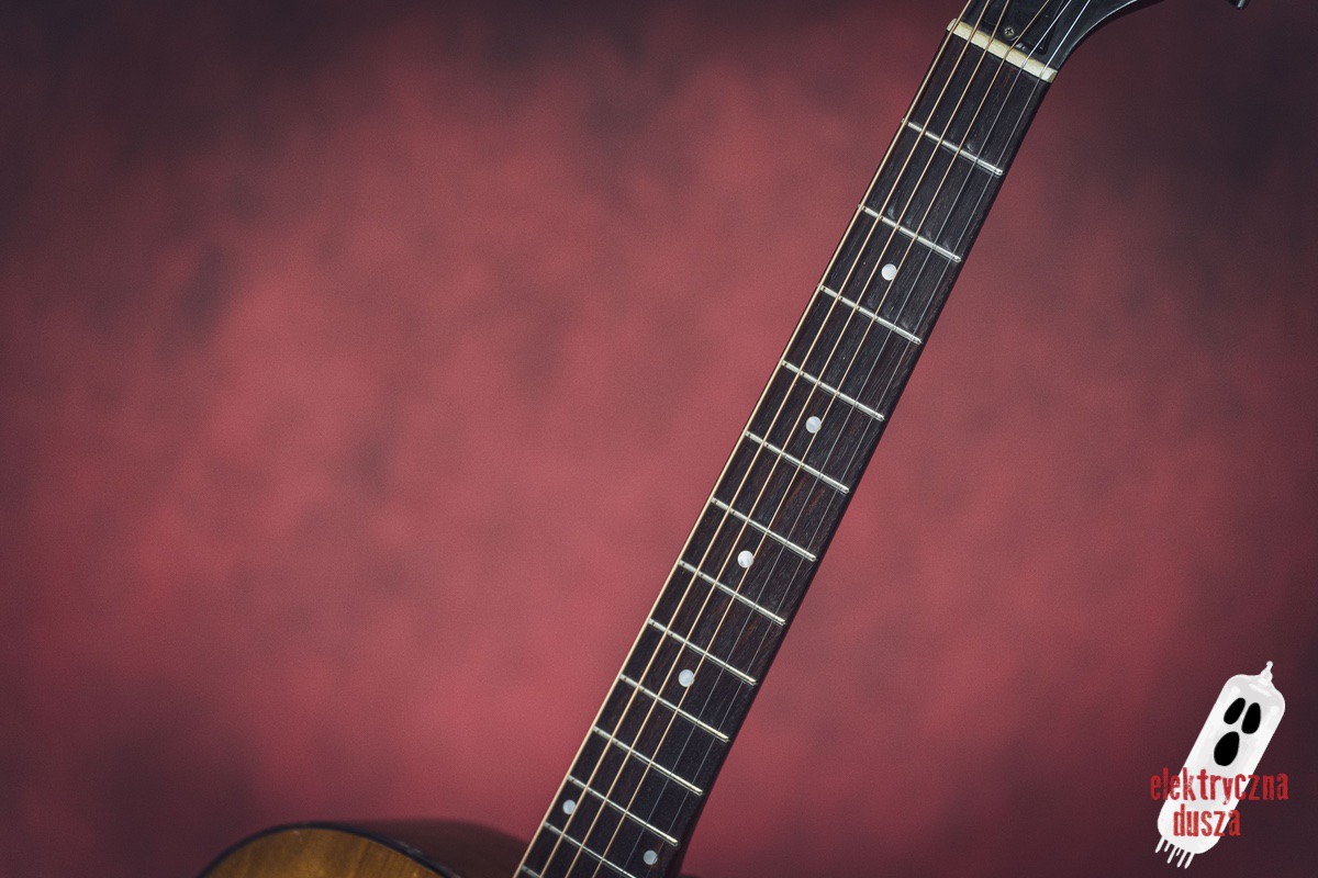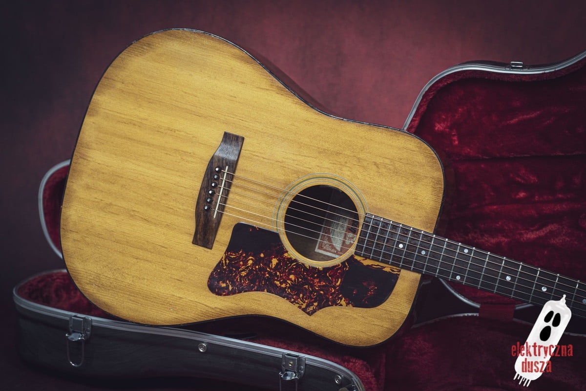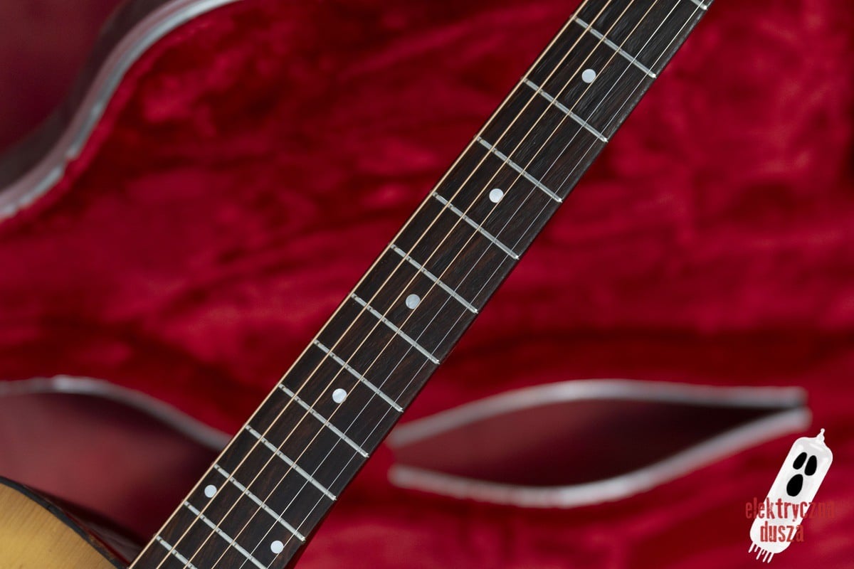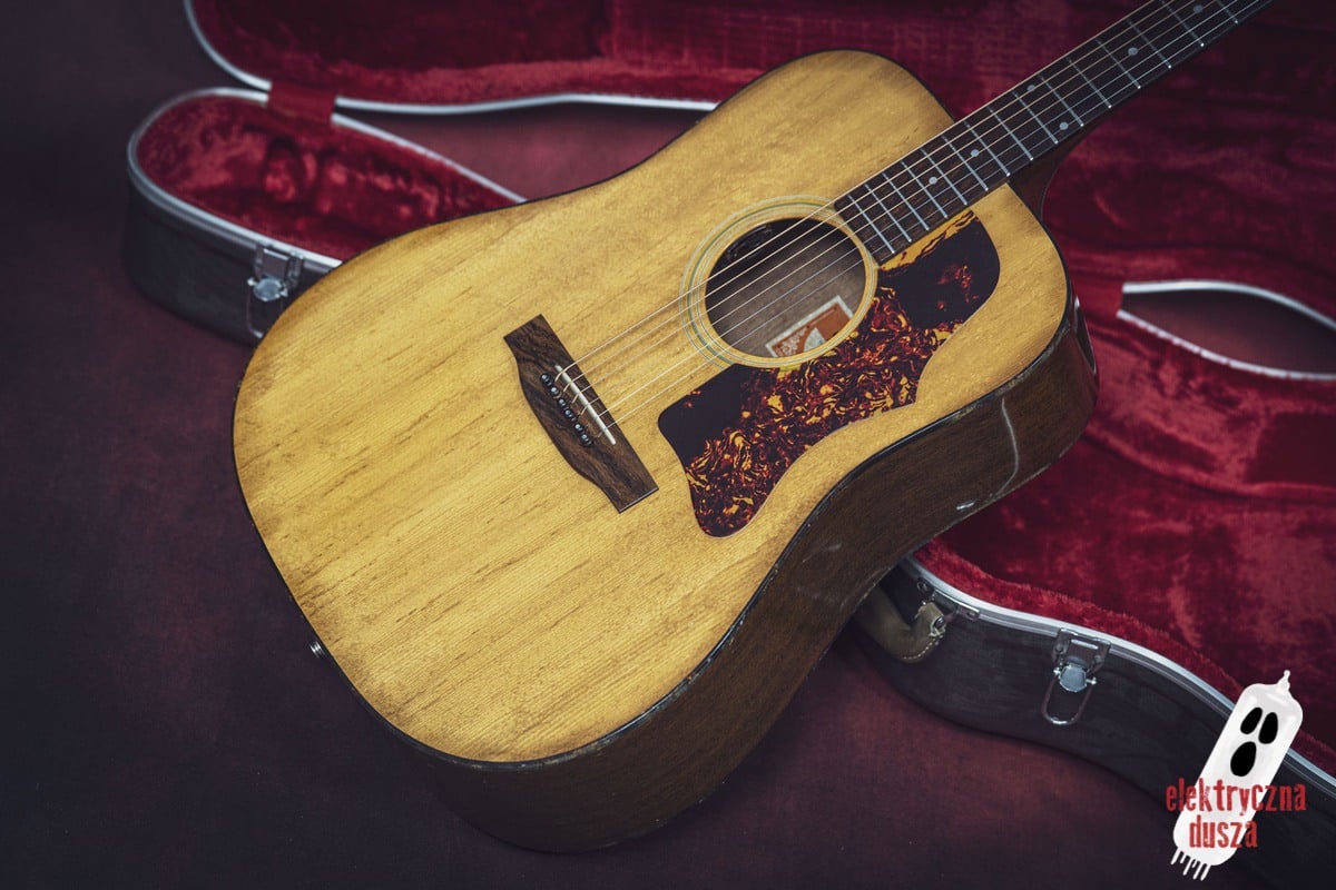 The J-55 is a classic square-shoulder dreadnought with a true western vibe. The guitar is made entirely from solid wood: a spruce top, mahogany back and neck, and a rosewood fingerboard. A characteristic feature of this model is the large folk-style pickguard and tortoise binding, which give the guitar a slightly luxurious look.
