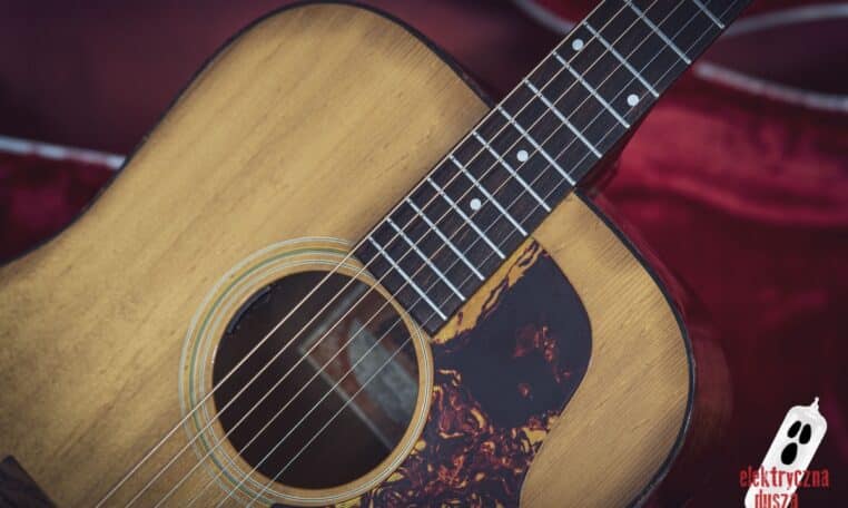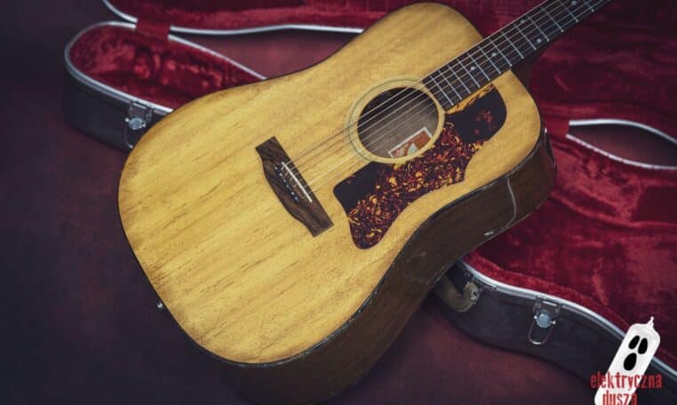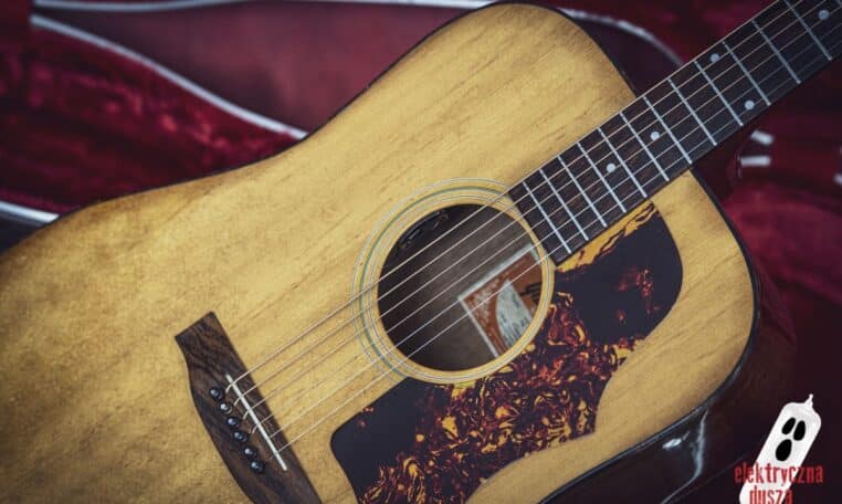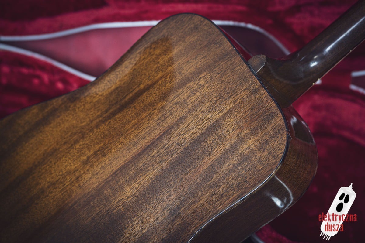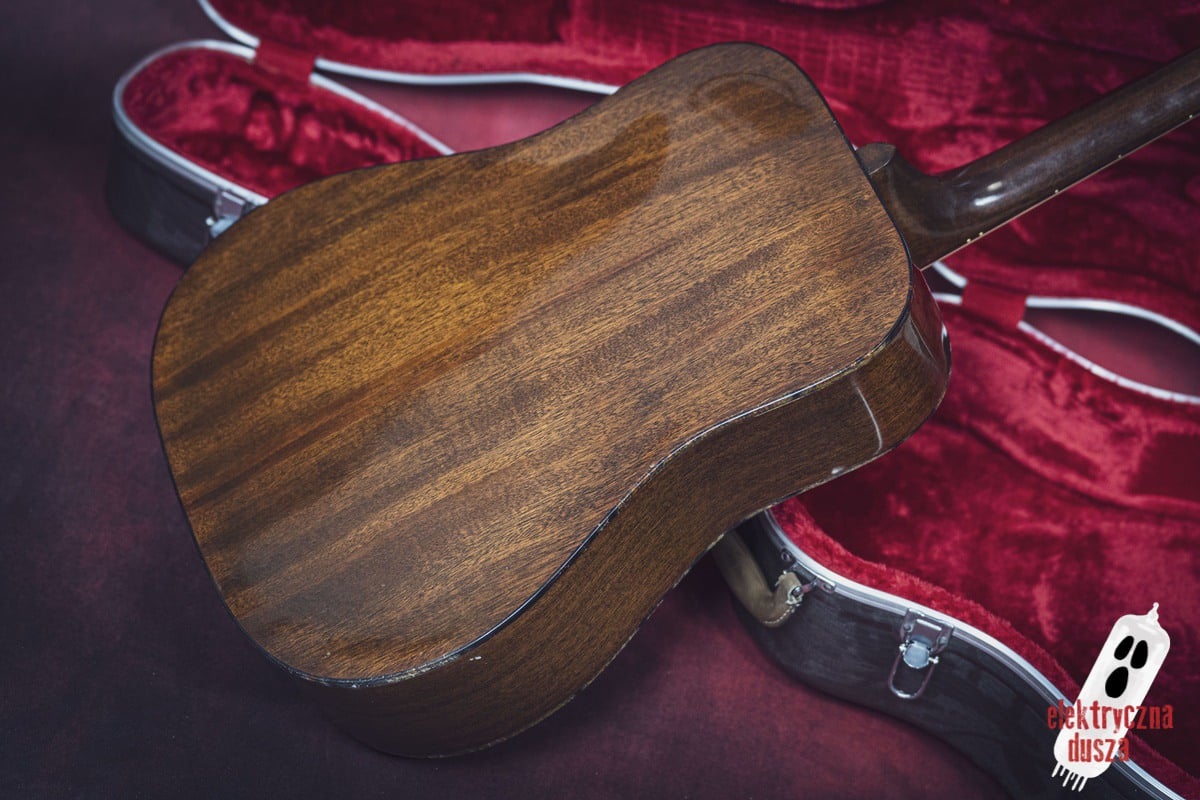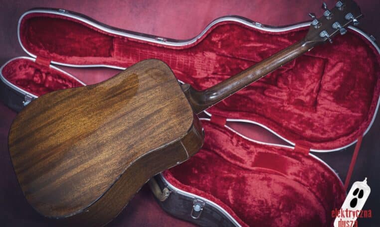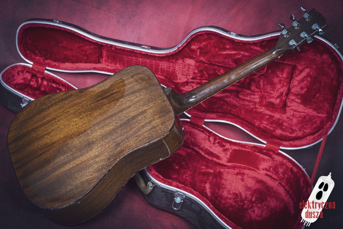 The J-55 is a classic square-shoulder dreadnought with a true western vibe. The guitar is made entirely from solid wood: a spruce top, mahogany back and neck, and a rosewood fingerboard. A characteristic feature of this model is the large folk-style pickguard and tortoise binding, which give the guitar a slightly luxurious look.