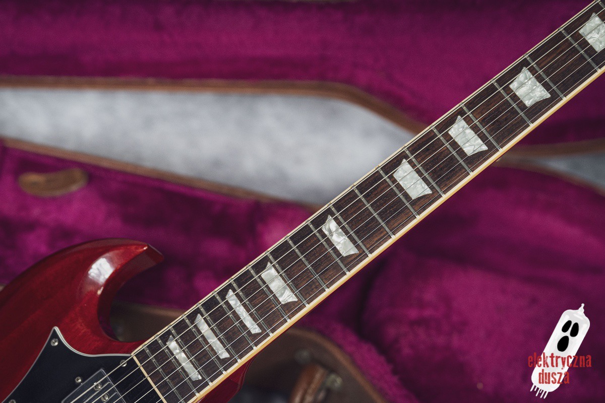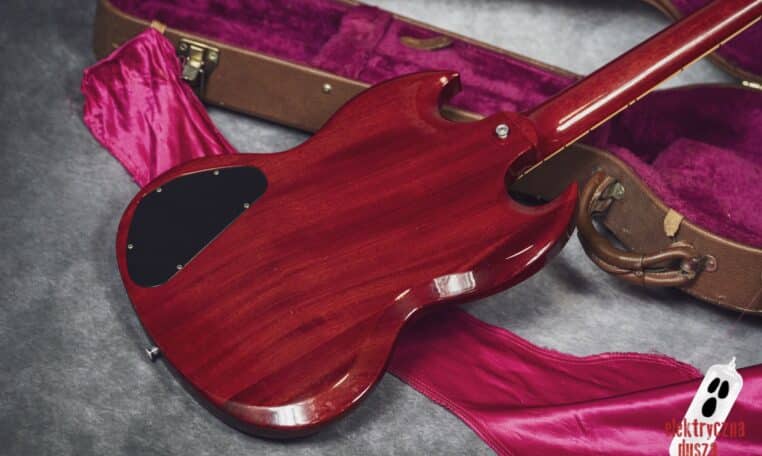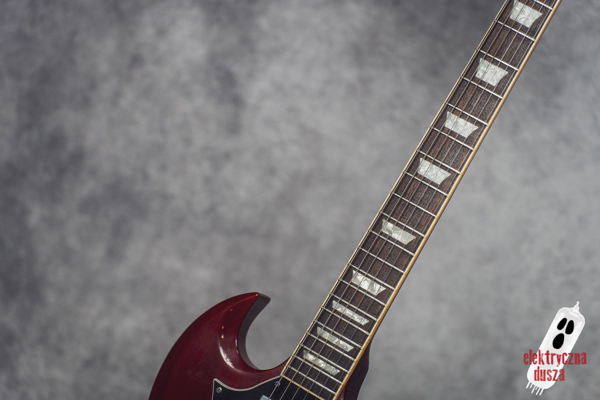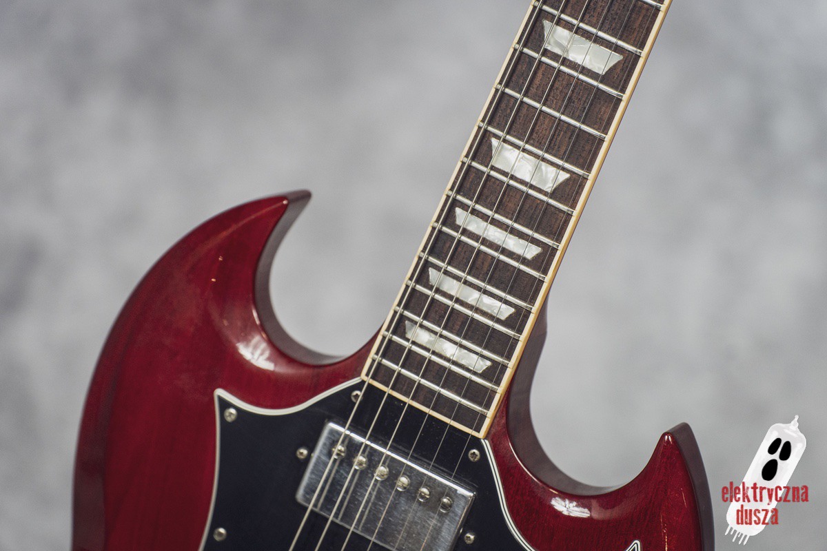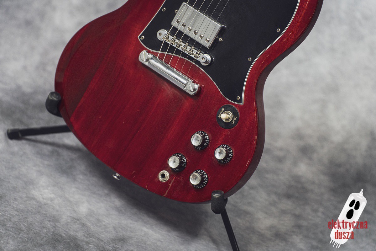 The guitar is 25 years old. It shows normal signs of use like scratches, small dings, and wear, giving it a bit of a vintage vibe. Near the input jack, there is a small crack typical for SG models with a front-mounted jack, but it does not affect performance. Technically, everything works perfectly. The guitar is in original factory condition, set up, and ready to play. The frets were lightly polished and don’t need any work.