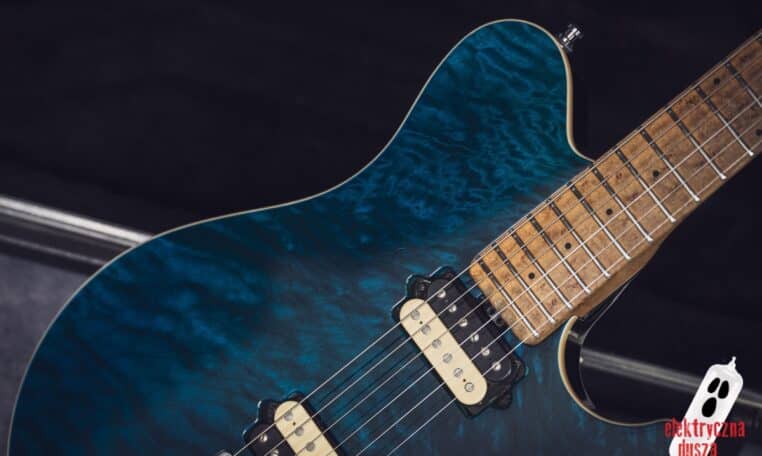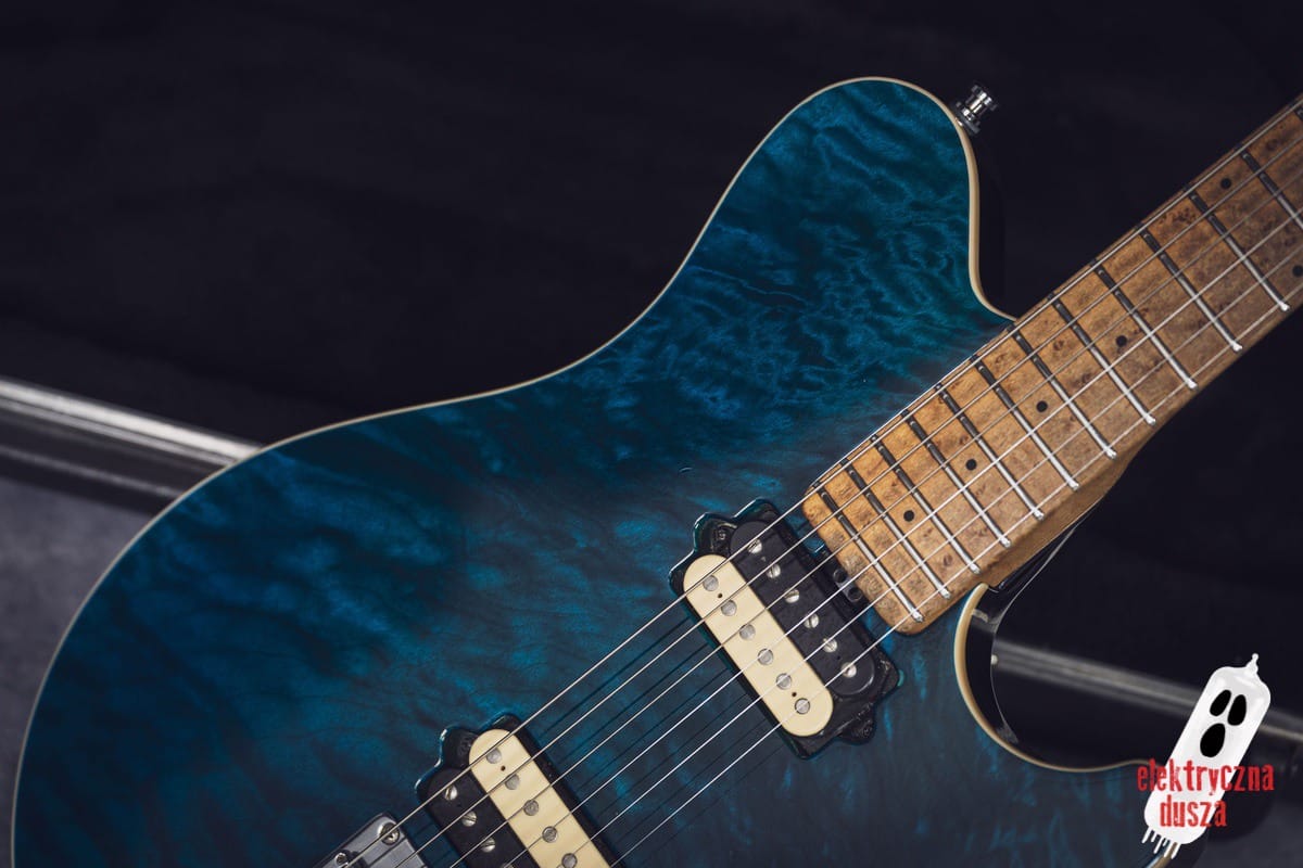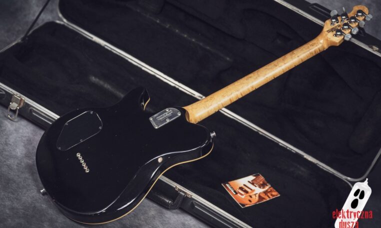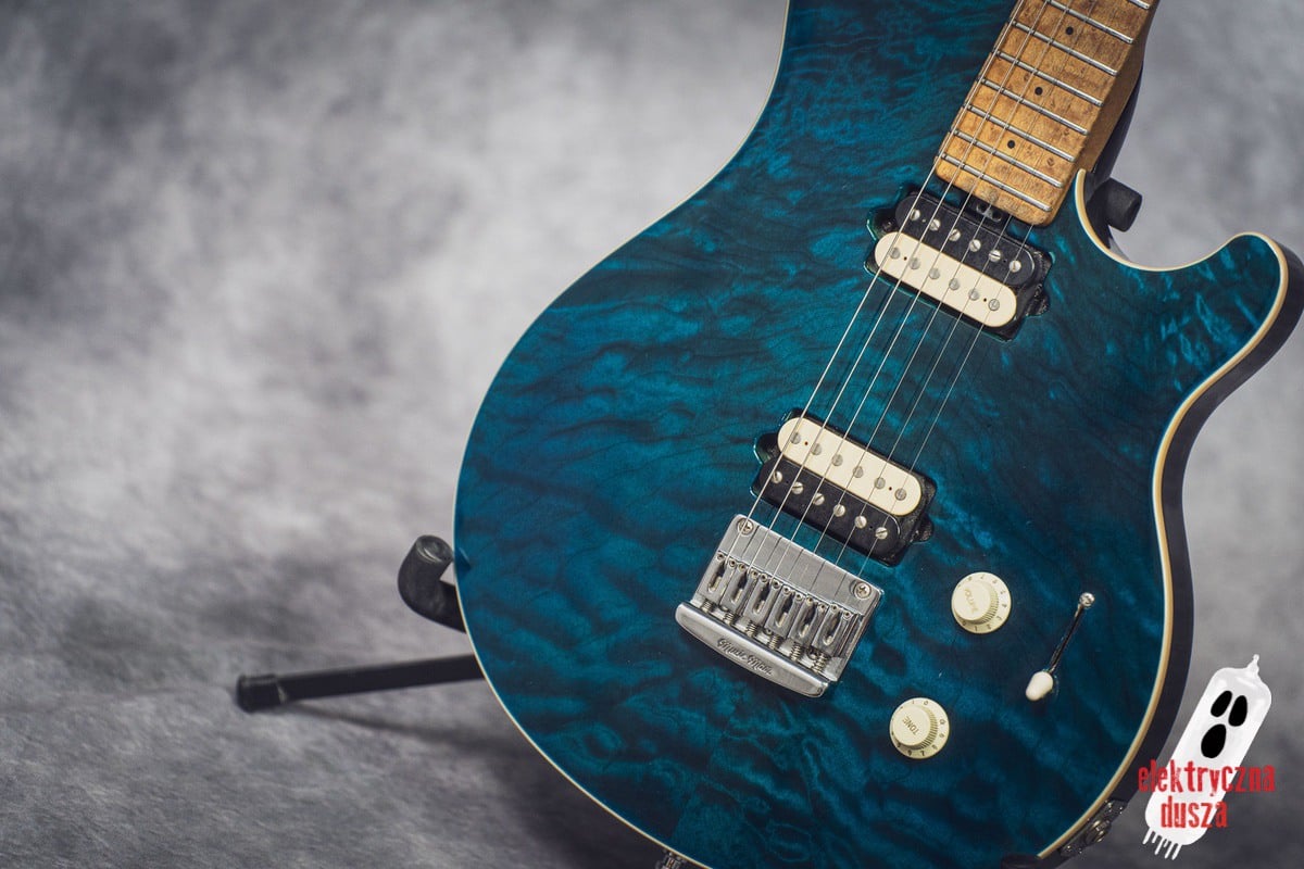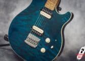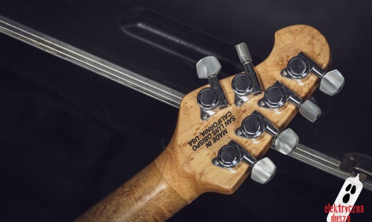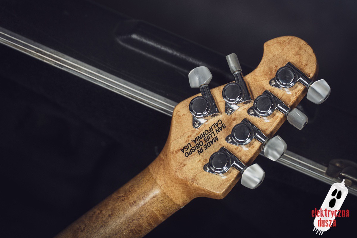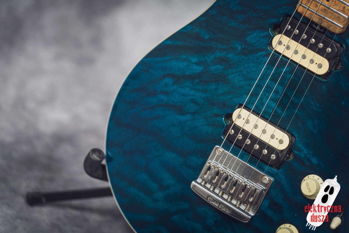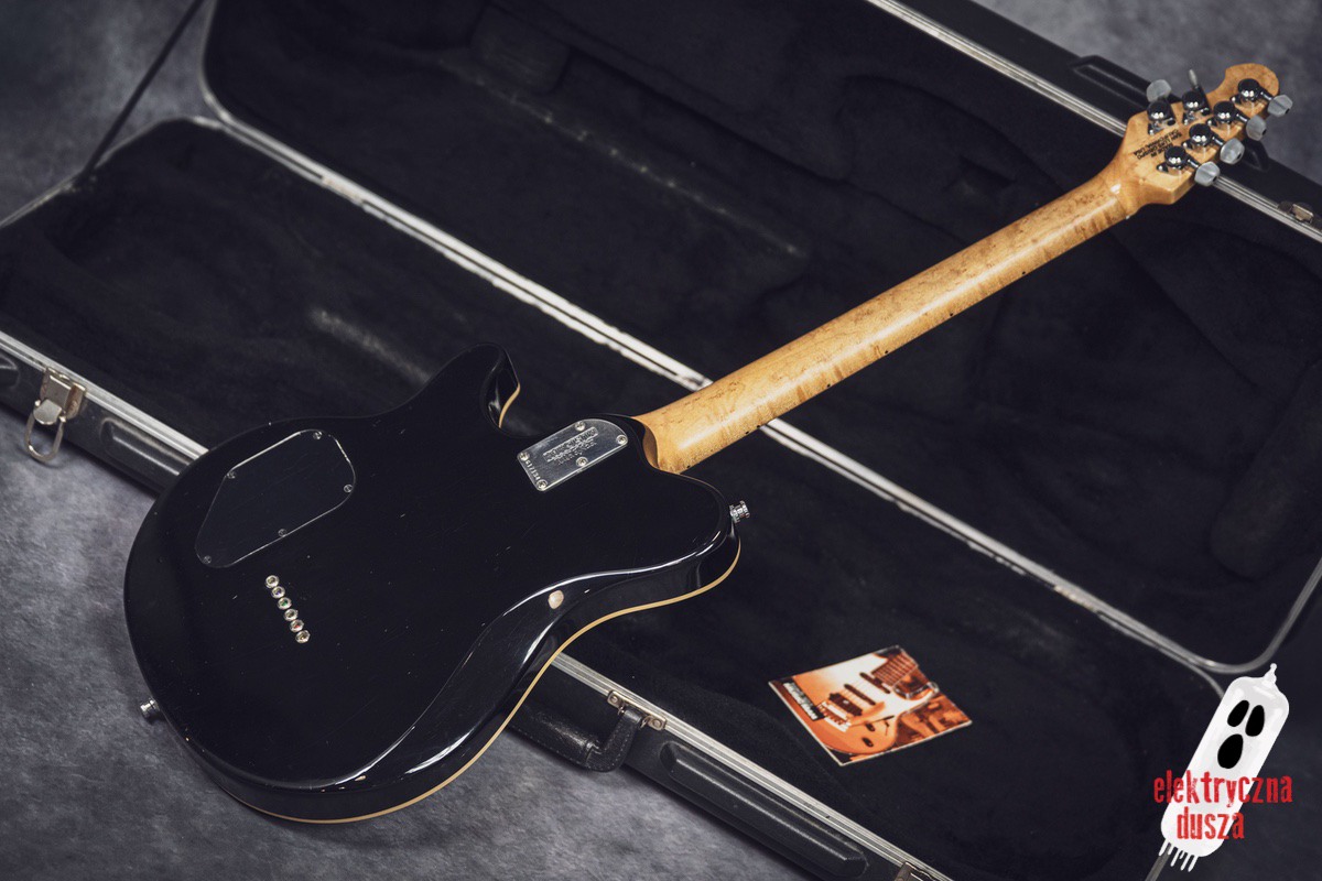 The guitar has a basswood body, which gives a balanced tone. The neck is made of birdseye maple with an oil and wax finish, and it is very comfortable to play. It also has special DiMarzio Custom pickups made for this model, known for clear sound and many tone options. The guitar has locking tuners and a fixed bridge, so it stays in tune very well. Like all Music Man instruments, it is very well made, even compared to custom shop guitars from other brands.