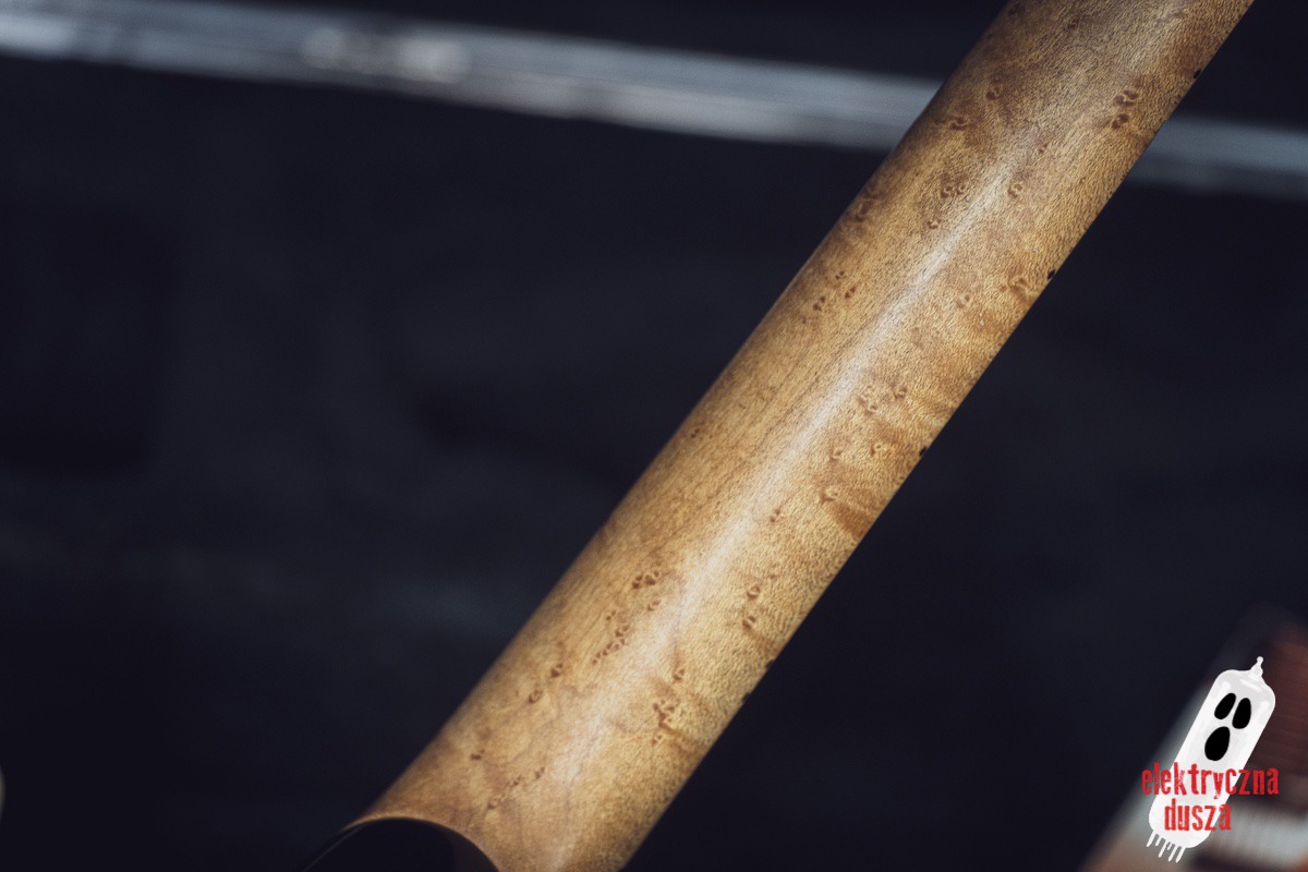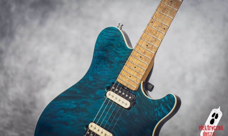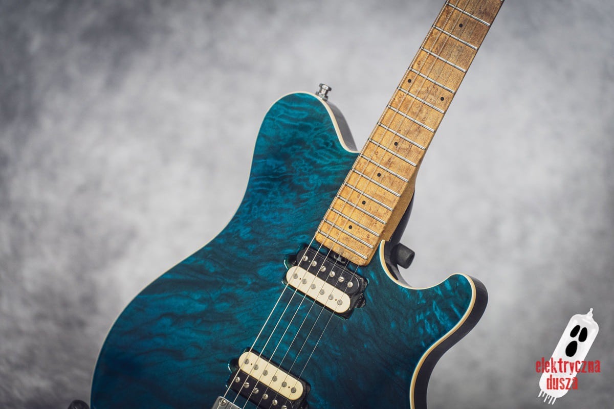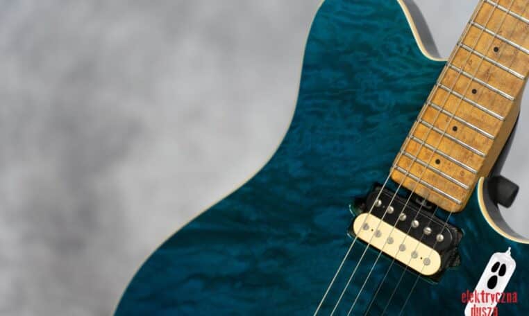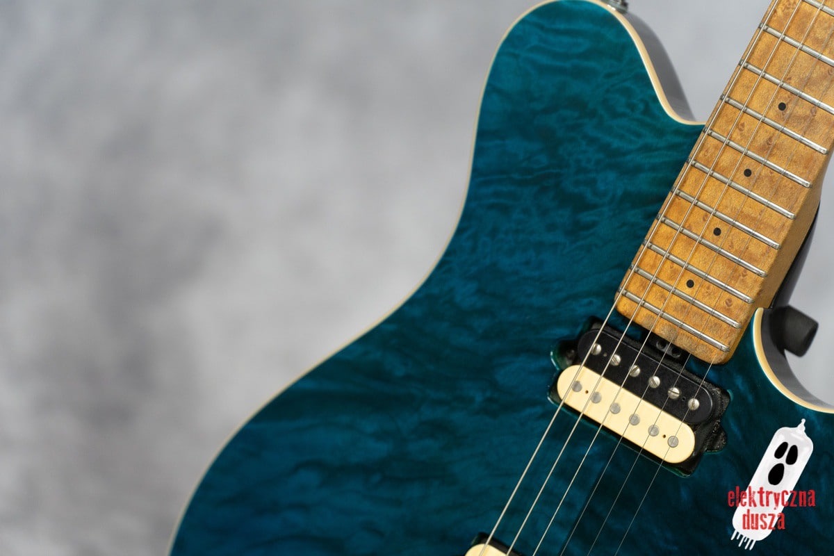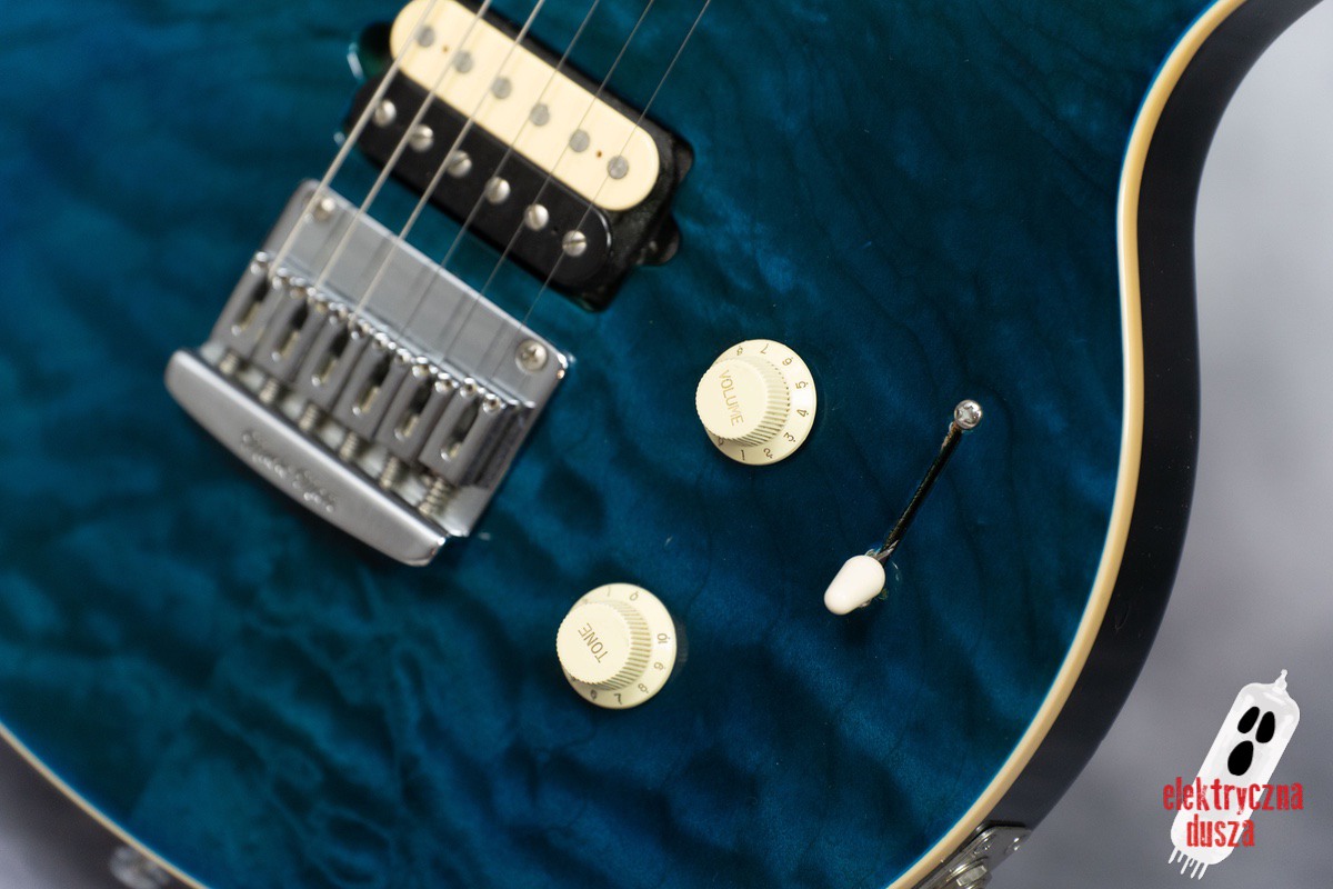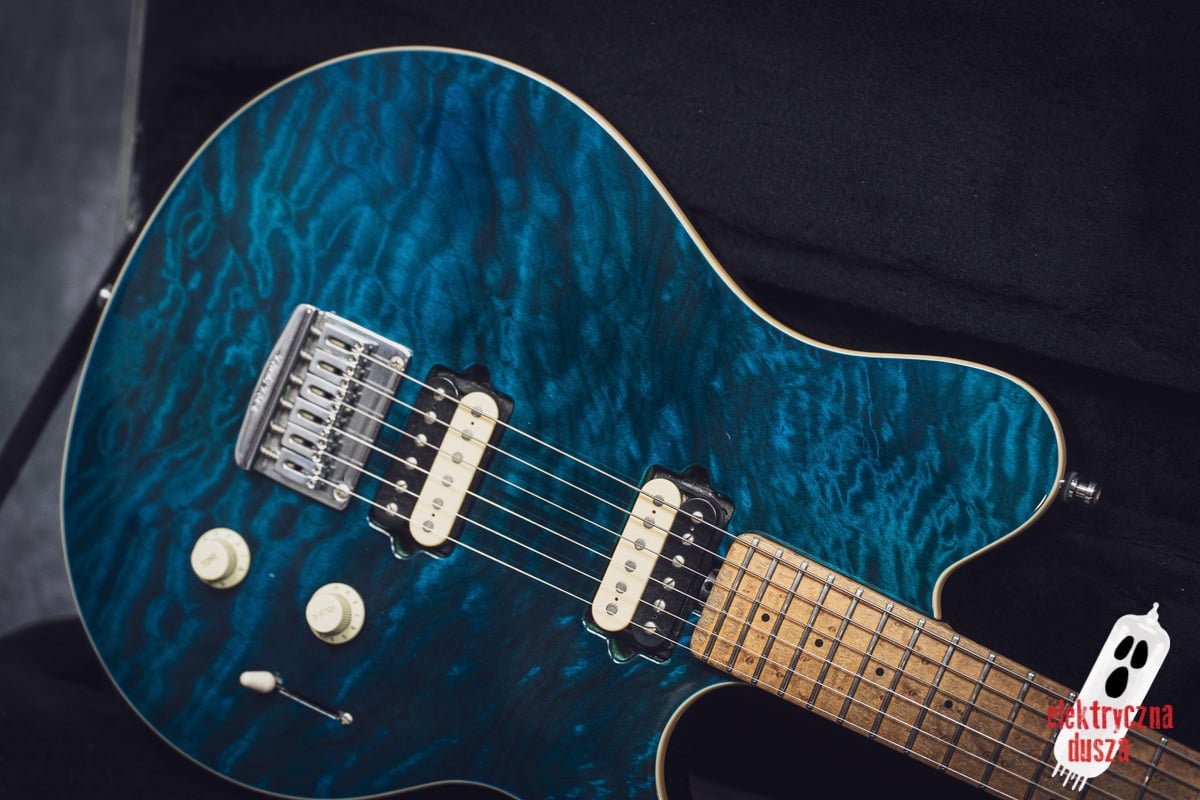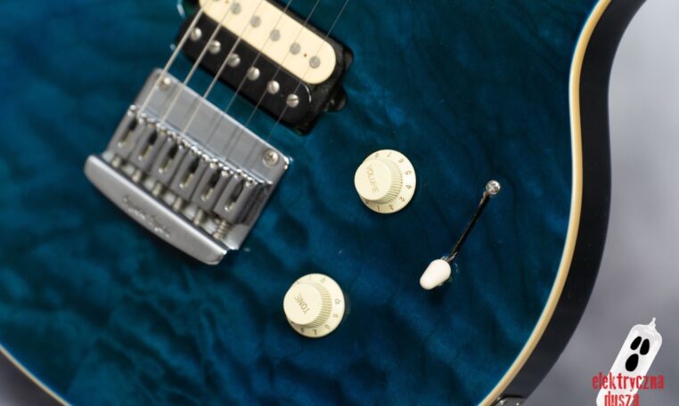 The guitar has a basswood body, which gives a balanced tone. The neck is made of birdseye maple with an oil and wax finish, and it is very comfortable to play. It also has special DiMarzio Custom pickups made for this model, known for clear sound and many tone options. The guitar has locking tuners and a fixed bridge, so it stays in tune very well. Like all Music Man instruments, it is very well made, even compared to custom shop guitars from other brands.