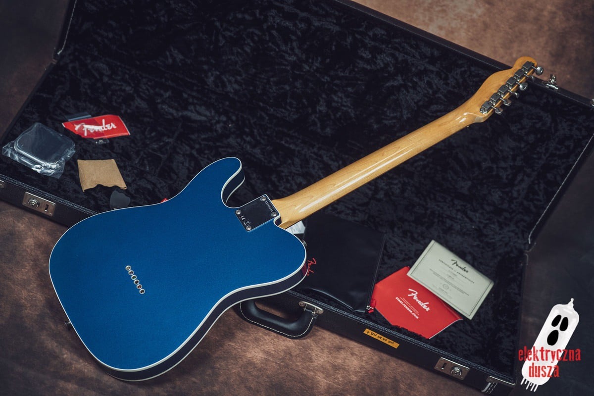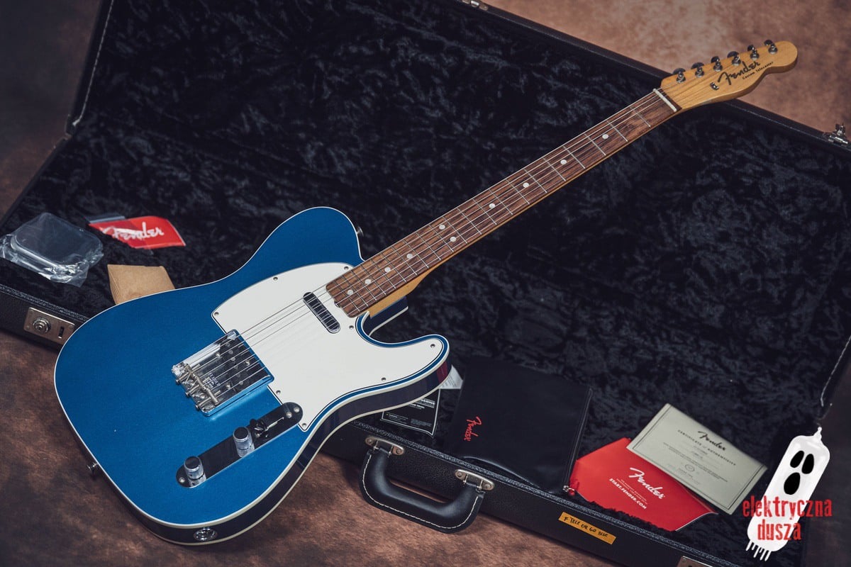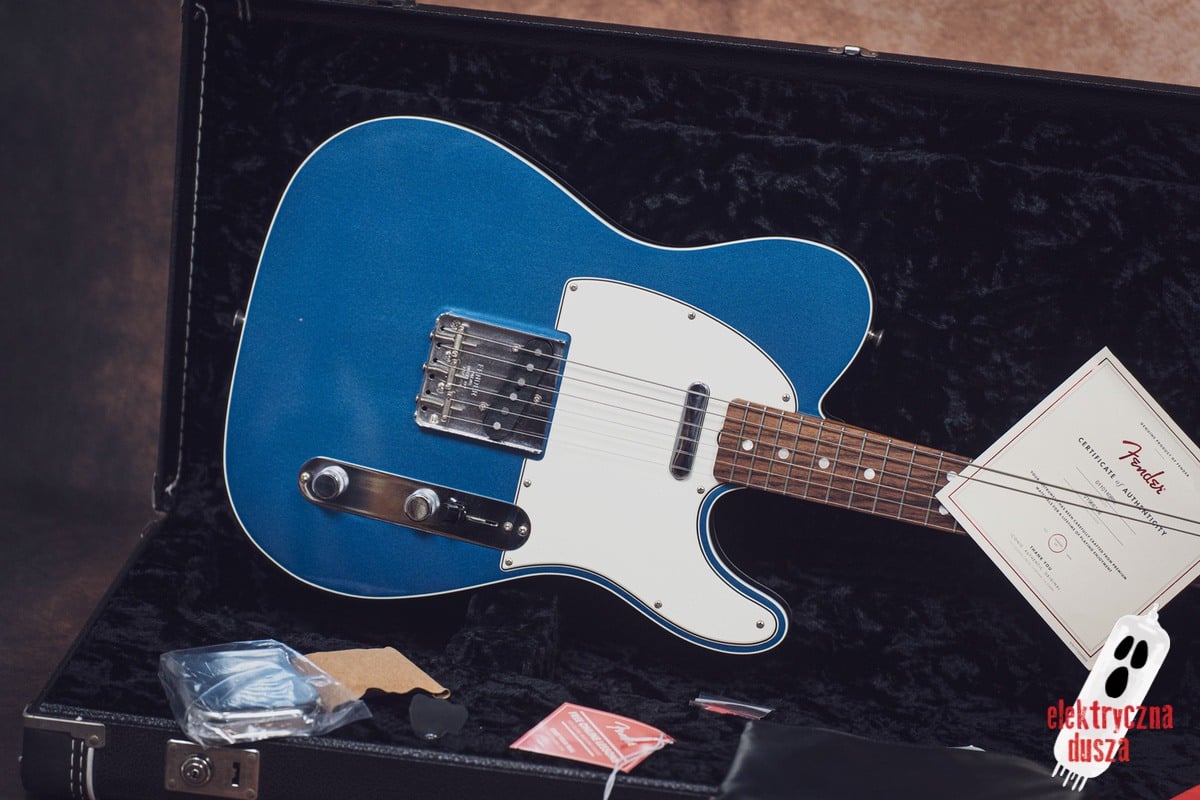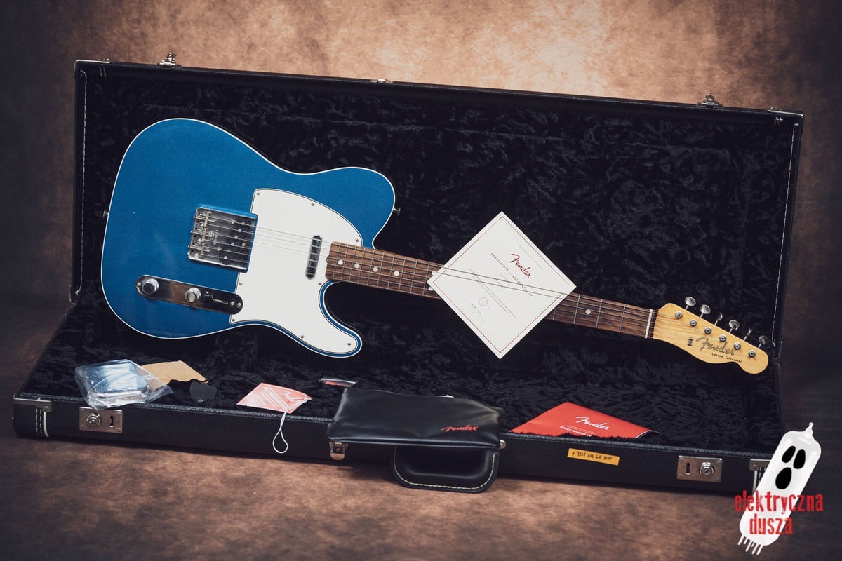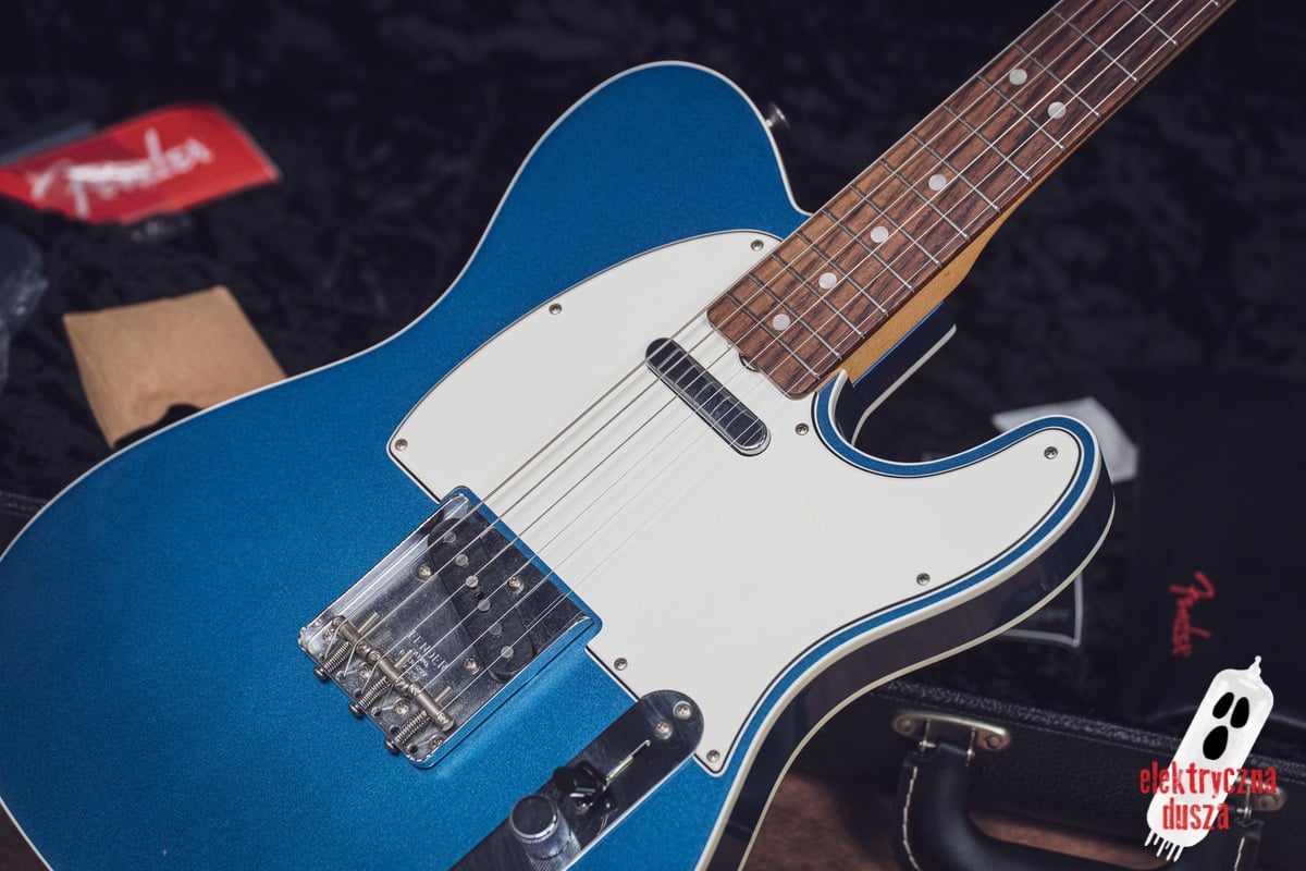 Elektryczna Dusza prezentuje gitarę Fender Telecastar. Jest to model 60’s Custom ze cenionej serii American Original (odpowiednik Am. Vintage), będącej zbiorem reedycji kultowych gitar z ważnych pod względem historycznym roczników. Tym razem sięgamy po luksusowego tele w kultowym kolorze Lake Placid Blue inspirowanego fantastycznym projektem z początku lat 60. Gitara zdecydowanie z górnej póki – charakteryzuje się wyborną specyfikacją i przepięknym wyglądem.