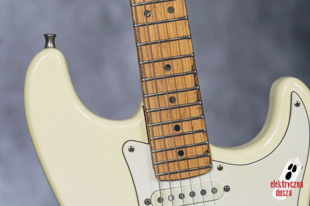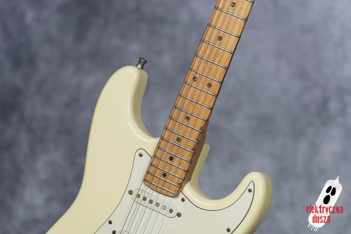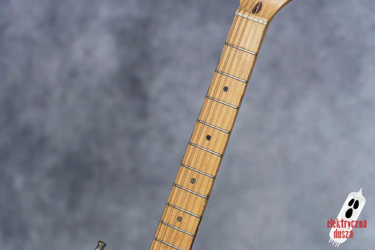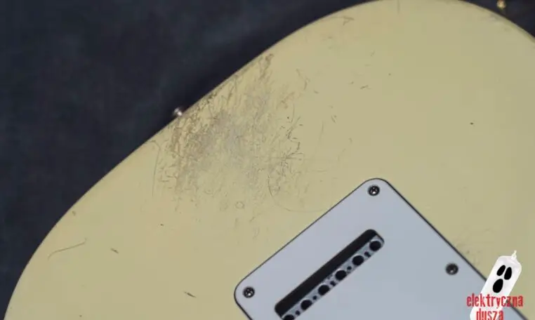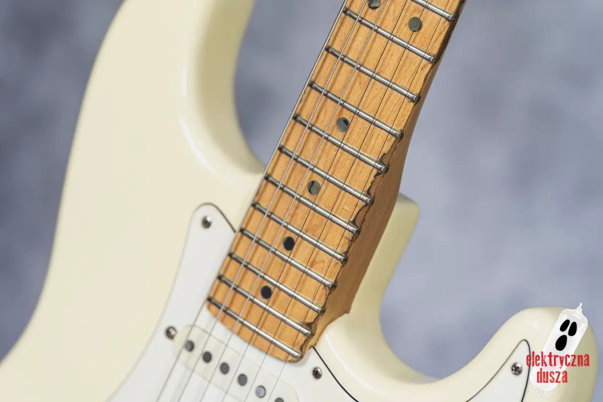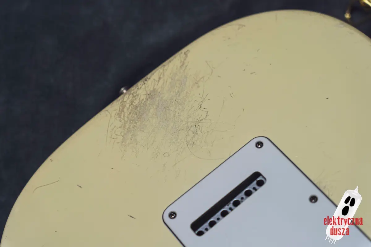 Choć gitara wygląda, jakby stoczyła bitwę pancerną, jest w bardzo dobrym stanie technicznym. W przeszłości miała wymienione progi, więc nie ma żadnych problemów grywalnością i jest ustawiona oraz gotowa do gry. Pickupy są oryginalne, osprzęt również. Działa wszystko od regulacji gryfu po elektronikę.