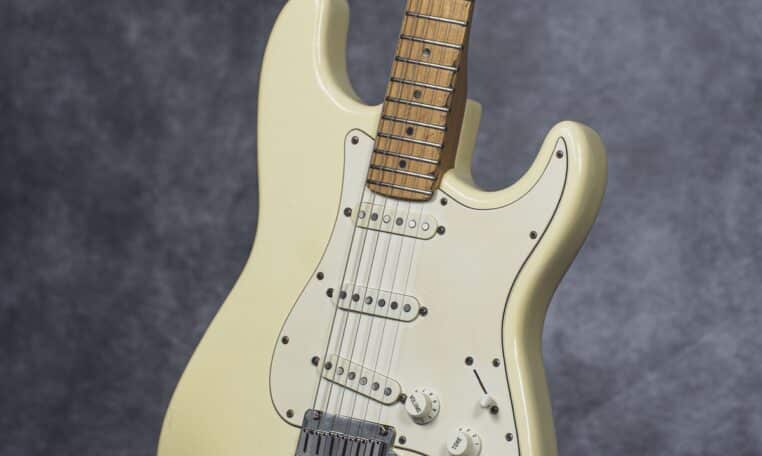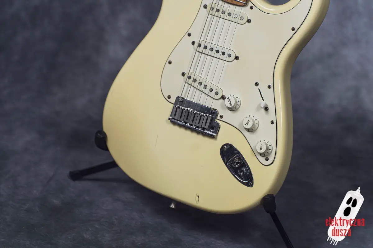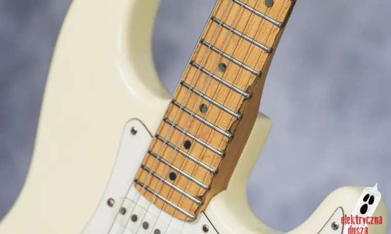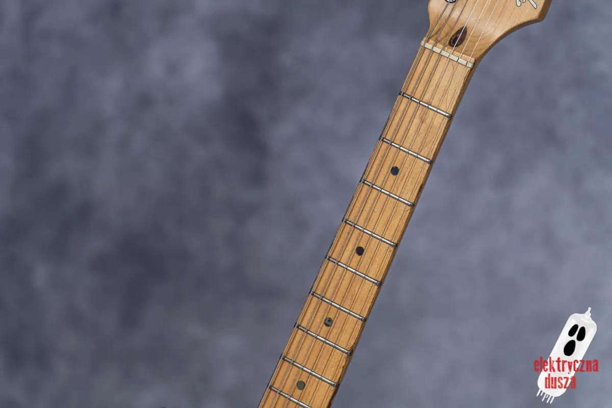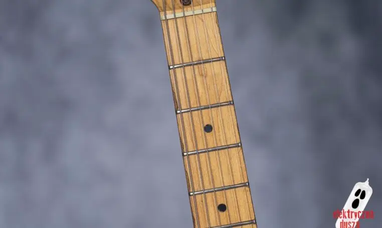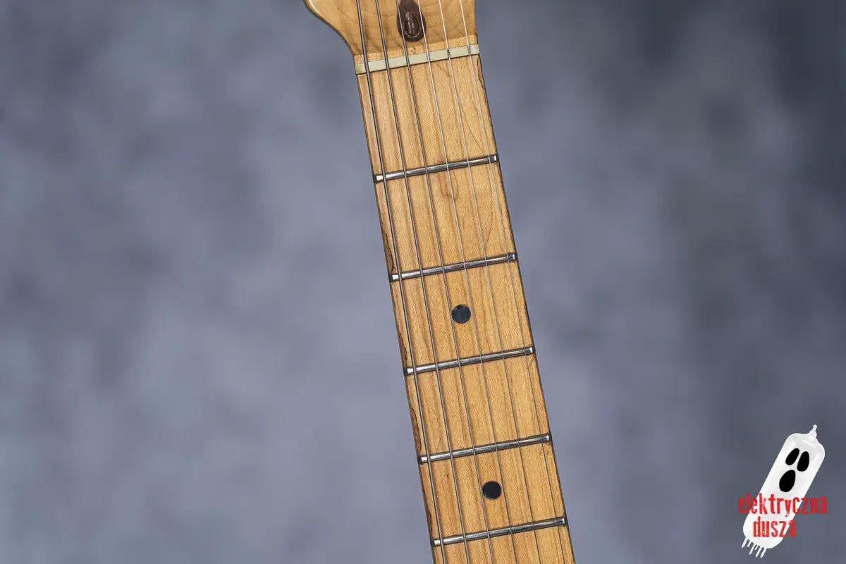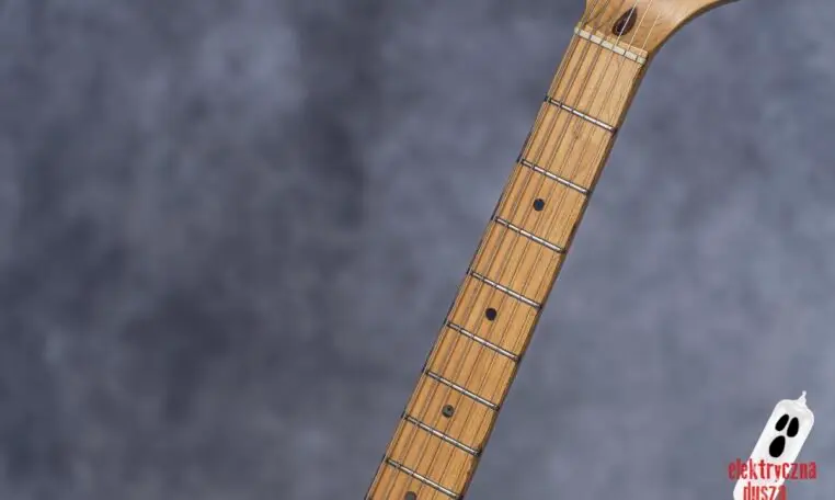 Choć gitara wygląda, jakby stoczyła bitwę pancerną, jest w bardzo dobrym stanie technicznym. W przeszłości miała wymienione progi, więc nie ma żadnych problemów grywalnością i jest ustawiona oraz gotowa do gry. Pickupy są oryginalne, osprzęt również. Działa wszystko od regulacji gryfu po elektronikę.