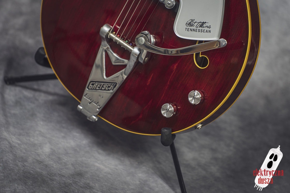 Kultowy ciemnoczerwony kolor, obowiązkowe Bigsby oraz znakomite przetworniki Hi-Lo’Tron to esencja stylu vintage’owych gitar Gretsch, którą w tym egzemplarzu można podziwiać w pełnej krasie. Gitara, mimo swojego wieku, pozostaje ponadczasowa i sprawdza się nie tylko przy graniu klasycznego repertuaru, lecz także w wielu współczesnych zastosowaniach, będąc co najmniej tak wszechstronną, jak gitarzysta Chet Atkins, od którego model wziął swoją nazwę.